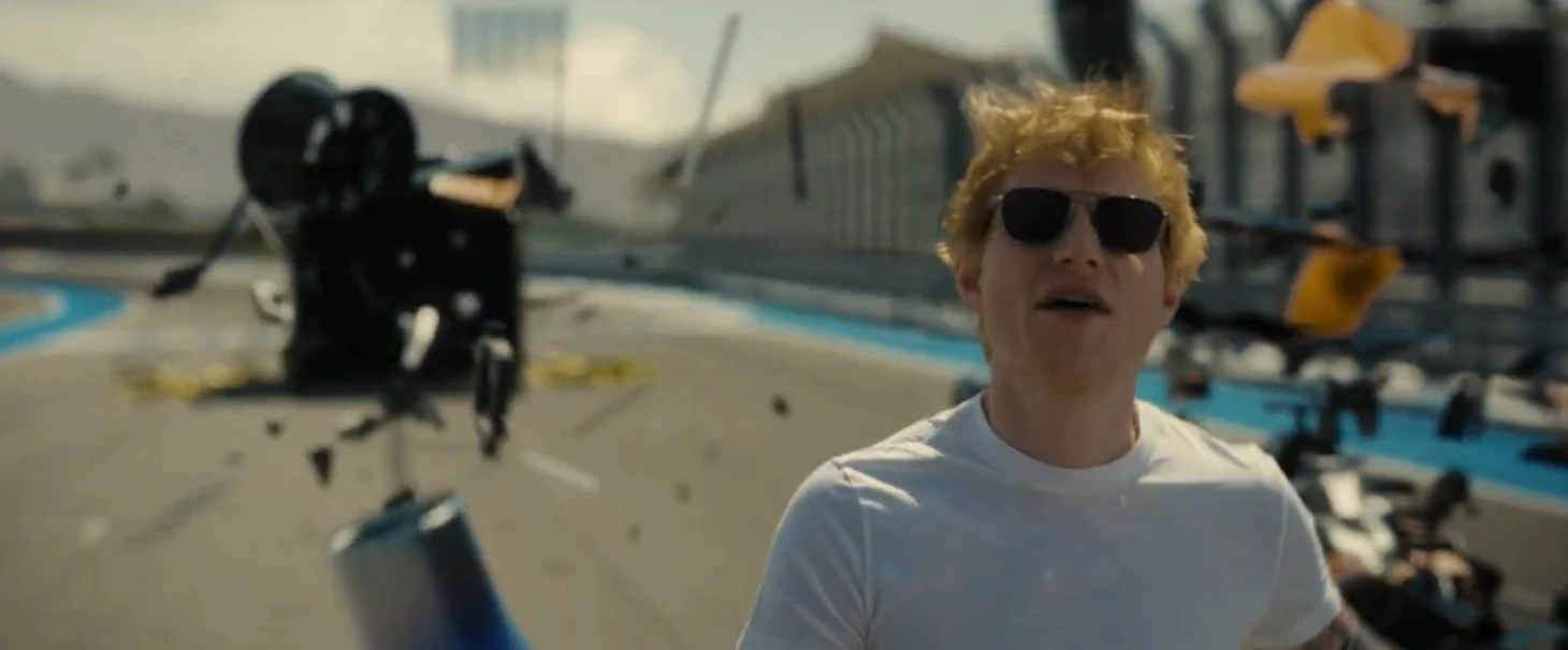 А тут Эд Ширан пролез в аэродинамическую трубу, в которой продувают новый болид APXGP. Вероятно, певец испортил все данные и сделал из команды аутсайдера (ведь трубу, к слову, арендовали у «Уильямса» при съемках фильма).