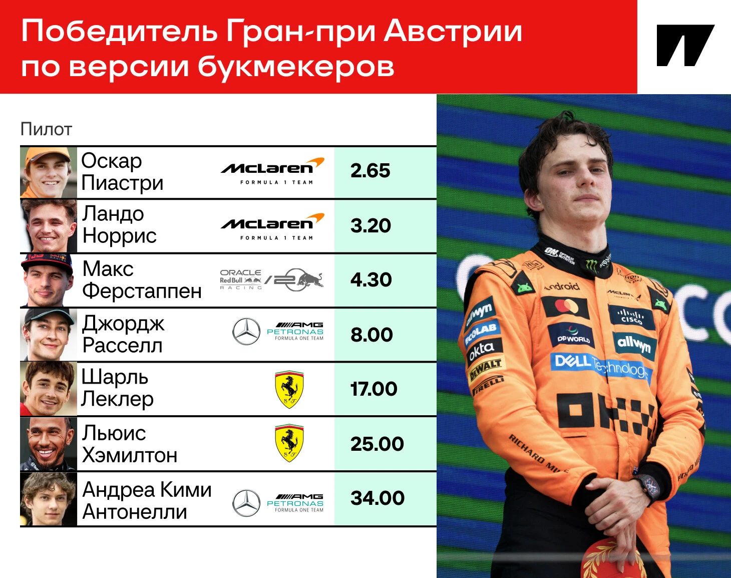 Традиционно фаворитом на победу является «Макларен». Букмекеры полагают, что вероятность первого места Норриса или Пиастри составляет 65%. При таком финале точно будут вспоминать последний мини-трофей команды в Австрии. У «Макларена» здесь нет побед с 2001-го – тогда выиграл Дэвид Култхард. Норрис мог выиграть и в прошлом году, но столкнулся с Ферстаппеном при сражении колесо в колесо. Что же теперь, проклятье падет?