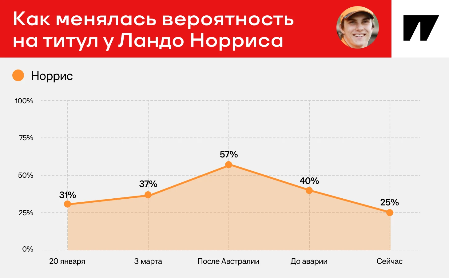 Ситуация в чемпионате стала угрожающей. Норрис отстает от партнера по команде на 22 очка – приличный разрыв, учитывая стабильность конкурента – Ландо после Австралии ниже четвертого места не опускался. Букмекеры теперь дают самый высокий коэффициент в сезоне на титул Норриса. Вероятность его победы понизилась до 25%. До странного обгона было 40%.