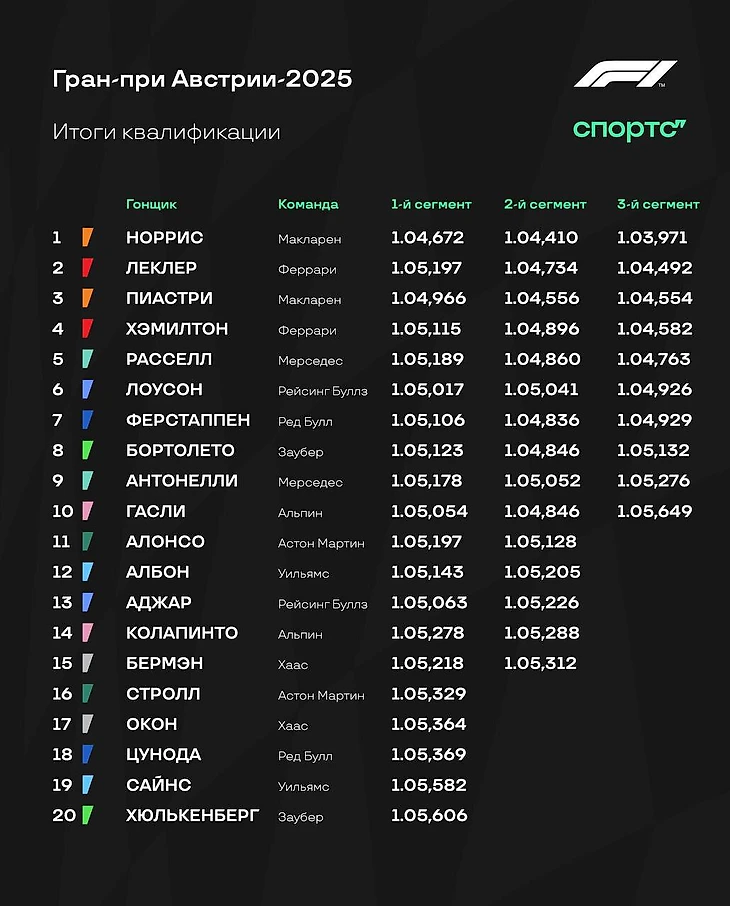 В числе наиболее впечатливших гонщиков мог оказаться и Пьер Гасли, но на финальном круге француза развернуло, и желтыми флагами он испортил не только квалификацию себе, но также главным соперникам Норриса – Ферстаппену и Пиастри.