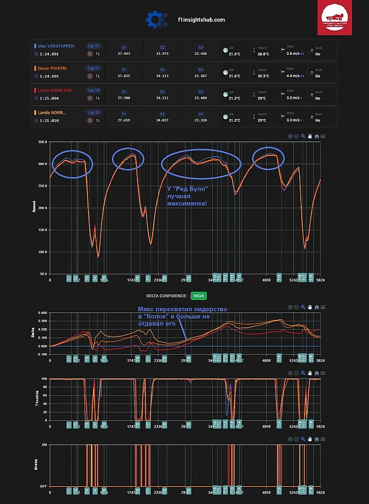 А тут у него болид по телеметрии самый быстрый на прямых и самый быстрый в скоростных поворотах (т.е. на 90% трека). То есть здесь, как минимум на одном круге Ред Булл быстрее. Посмотрим что будет в гонке. Но сам Макс говорил, что РБ не уступает Макларену в гоночном темпе. Откуда вы такие "свидетели скилла" беретесь???