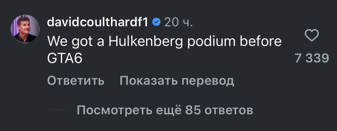 «Подиум Хюлькенберга случился раньше выхода GTA 6», – пошутил он под постом «Ф-1» в соцсетях.