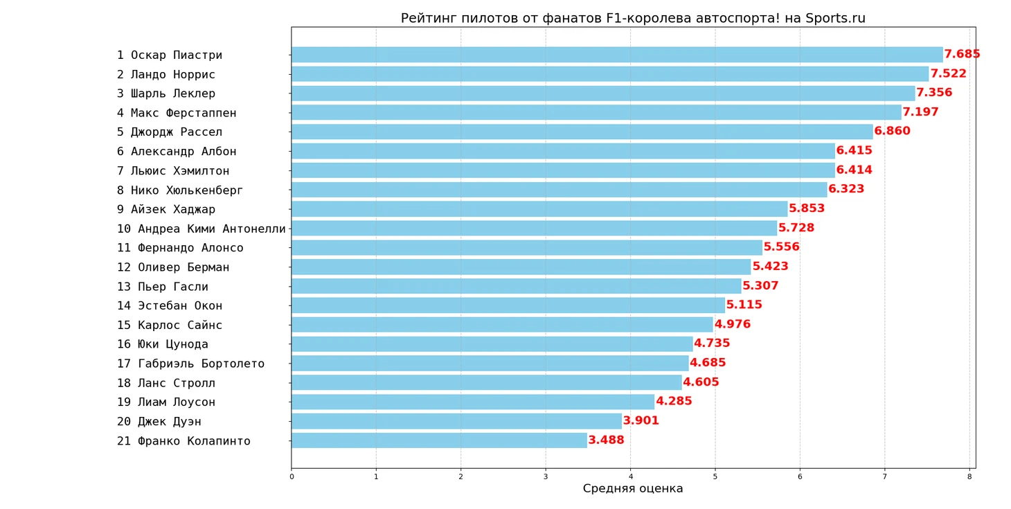 Народный рейтинг «Ф1» после Австрии и Великобритании: Пиастри, Норрис и Леклер в лидерах. Колапинто остается худшим