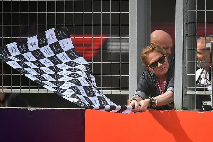 Обычно появление такой знаменитости в паддоке спойлерит нам того, кто в конце гонки взмахнет клетчатым флагом. На этот раз ожидания были обмануты – важную работу исполнил лидер американской группы Guns N’ Roses Эксл Роуз.
