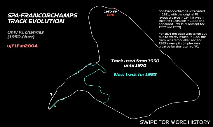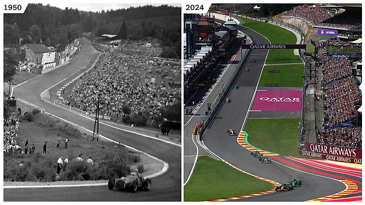 Как и многие трассы по всей Европе, Спа, длинная трасса в Арденнском лесу, нуждалась в ремонте после Второй мировой войны, и изменения позволили увеличить ее скорость. В те первые годы существовали серьезные опасения по поводу безопасности, так как в авариях погибло множество людей. Джеки Стюарт возглавил движение за более безопасные условия, и гонщики бойкотировали гонку «Формулы-1» 1969 года, когда улучшения не были сделаны. Гоночные соревнования вернулись в следующем году, но «Формула-1» в конечном итоге покинула трассу.