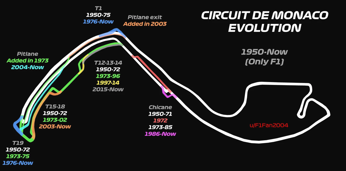 Появление секции у бассейна в 1970-х годах кардинально изменило конфигурацию трассы: вокруг бассейна были построены четыре поворота, а в 1986 году появилась шикана «Нувель». Но самое последнее изменение на трассе в Монако произошло в 2015 году, когда был изменен профиль поворота «Табак». Монако часто критикуют за малое количество обгонов из-за тесноты трассы, что усугубляется эволюцией автомобилей за эти годы.