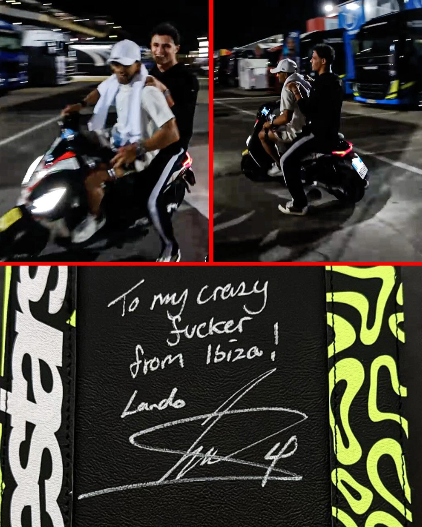 Британец также пообщался с легендарным Валентино Росси и посвятил надпись в боксах «Априлии» своему другу по вечеринкам в Испании, выступающему за итальянскую команду – действующему чемпиону Хорхе Мартину: «Моему безбашенному ***** [отморозку] с Ибицы! Ландо».