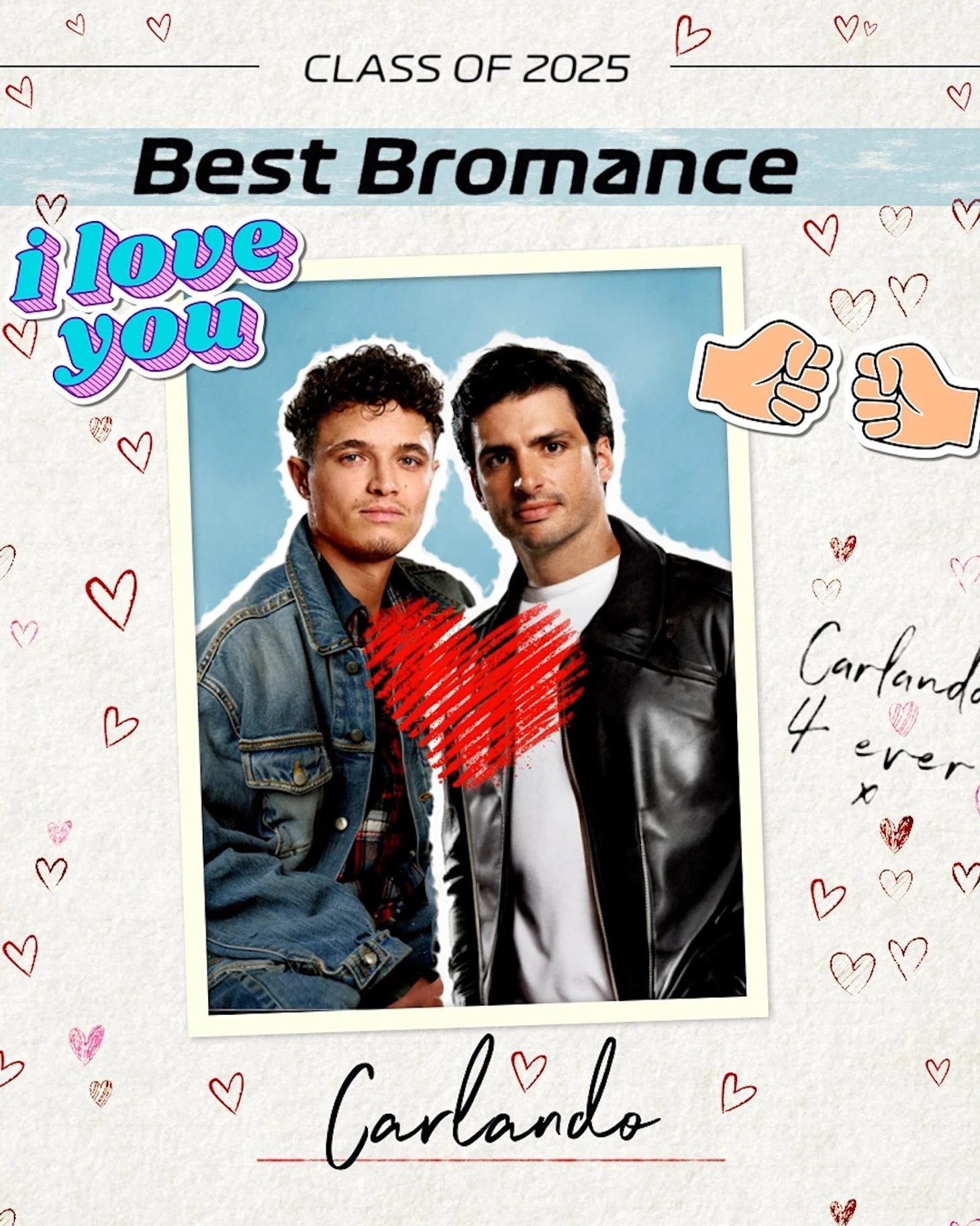 Неожиданная номинация – лучший броманс. Это слово обозначает крепкую дружбу между лицами мужского пола. Никто не назвал дуэт Ферстаппен – Норрис, несмотря на то, что на трассе у них возникали недопонимания, за их пределами они оставались друзьями. Кроме этого после совместной работы в «Феррари» отличные отношения остались у Карлоса Сайнса и Шарля Леклера. Но гонщикам виднее, потому лучший броманс паддока – Карландо (Карлос Сайнс + Ландо Норрис). Они провели вместе в «Макларене» два года, чего было достаточно для прочной дружеской связи. При этом слово «Карландо» произнес сам Карлос.