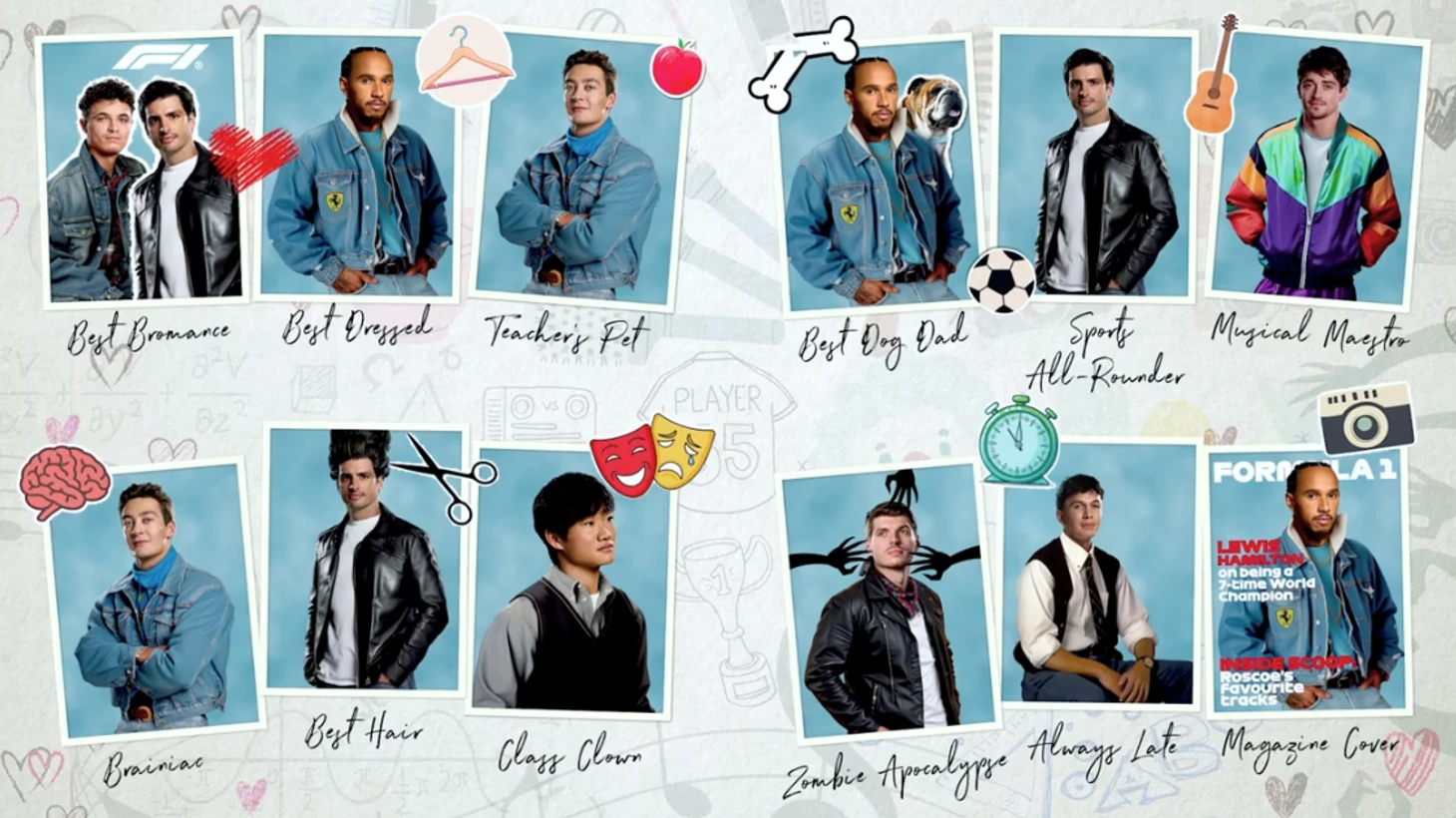 Номинации или категории носят шуточный характер, хотя практически все гонщики брали паузу на размышления и серьезно подошли к ответам на вопросы. У кого лучшие волосы, кто любимец учителя, школьный весельчак, модник, музыкальный маэстро, умник, собачий папа (Льюис, ты сам продавил ее?), мастер во всех видах спорта? Кому стоит подарить будильник, ведь он вечно опаздывает? Ну и самая неочевидная номинация – броманс (дружеские отношения между двумя гонщиками).