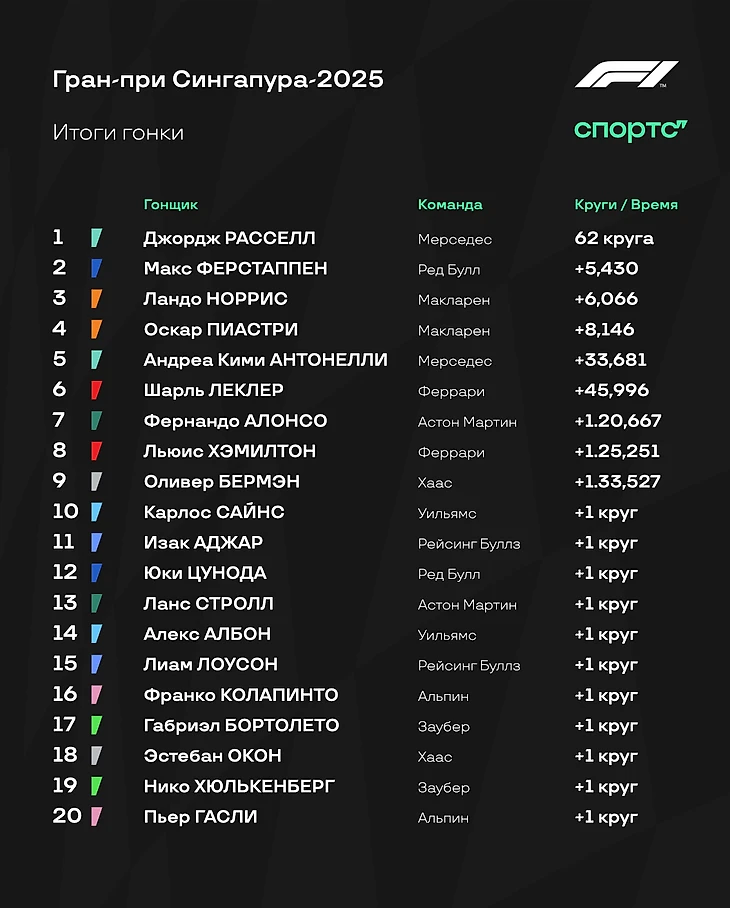 Расселл блестяще довел гонку до победы – без единой помарки и с выигрышем ключевого старта. Ферстаппену пришлось стараться и страдать намного больше, но и второе место на нелюбимом треке под давлением главных конкурентов – блестящий результат.