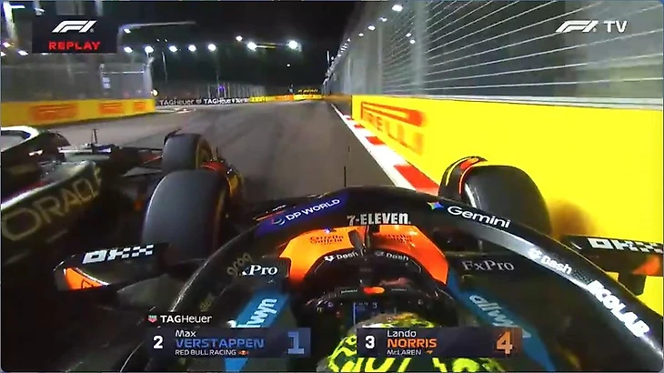 На 54-м круге Норрис впервые атаковал Ферстаппена впритирку со стеной – но Макс не отступил.