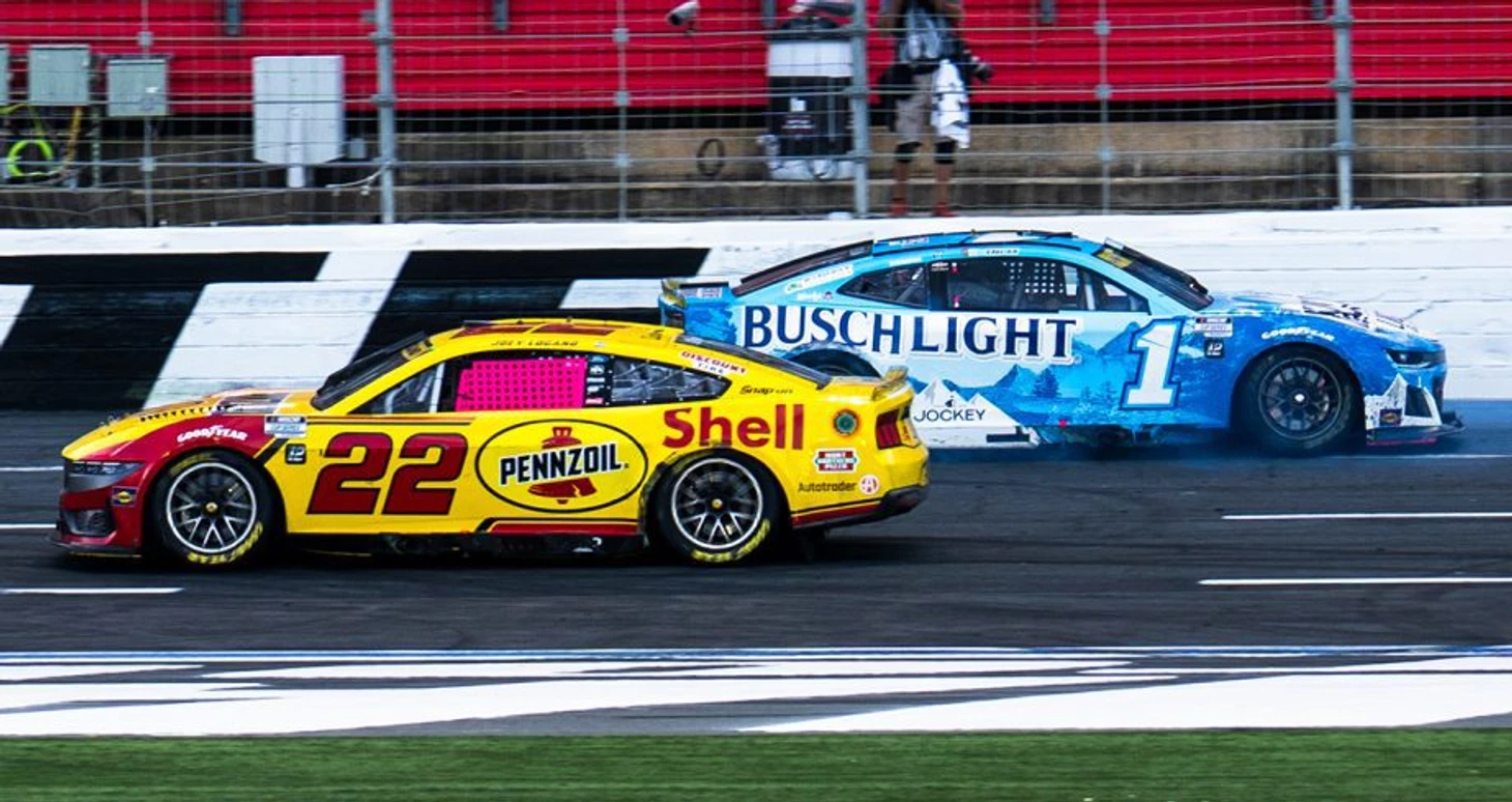 Финиш гонки между Россом Честейном (№1) и Джоуи Логано (№22)