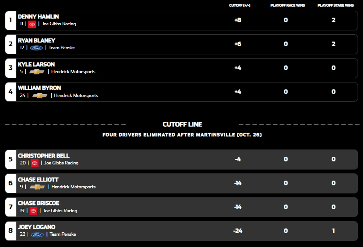 Вот и закончился раунд 12 Кубка NASCAR 2025 года. Осталось лишь три гонки полуфинала и финал в Финиксе. Текущая ситуация в плей-офф: