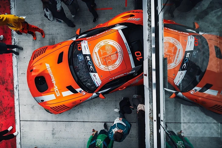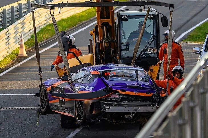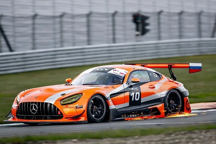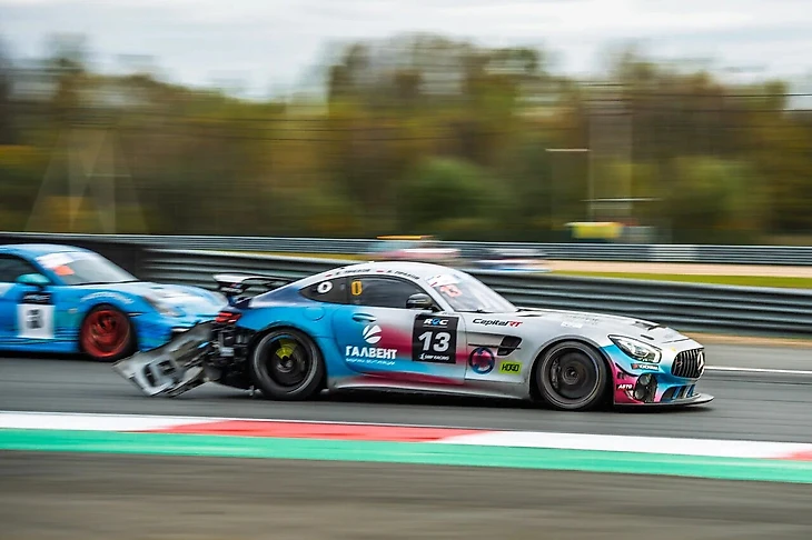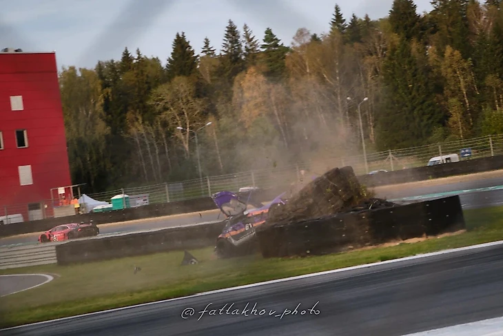 Еще один контакт с соперником имел уже более серьезные последствия для команды дебютантов VRC-Team. После того, как на торможении их «Мерседес» AMG GT4 «догнал» и отправил в разделительную стену у въезда на пит-лейн аналогичный автомобиль.