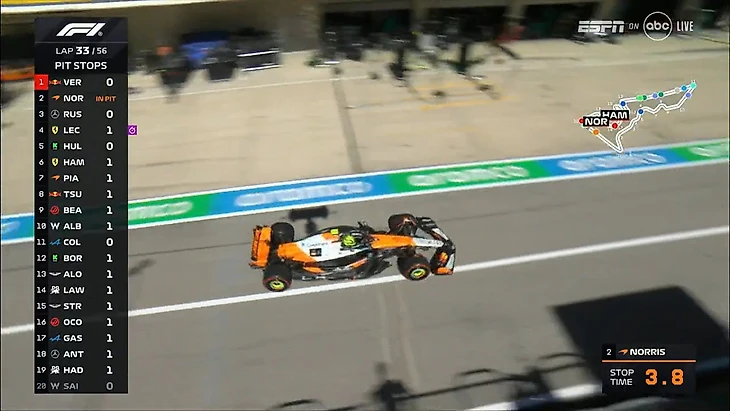 Норрис заехал в боксы следом на 33-м круге – вернулся в трех секундах за Леклером. Вновь не лучший пит-стоп, когда остановка идет подряд – 3,8 секунды. Оказывается, прямо перед остановкой Ландо серьезно заблокировал колесо и потерял около секунды.