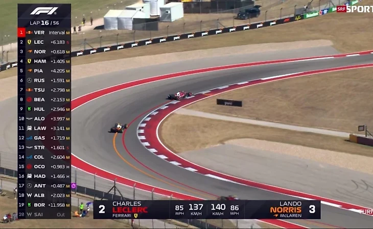 Ландо атаковал по параллельной траектории, но Леклер нашел такую траекторию, что «Макларен» не сумел воспользоваться преимуществом в разгоне и сцеплении. Но Ферстаппен выиграл на этой битве еще секунду.