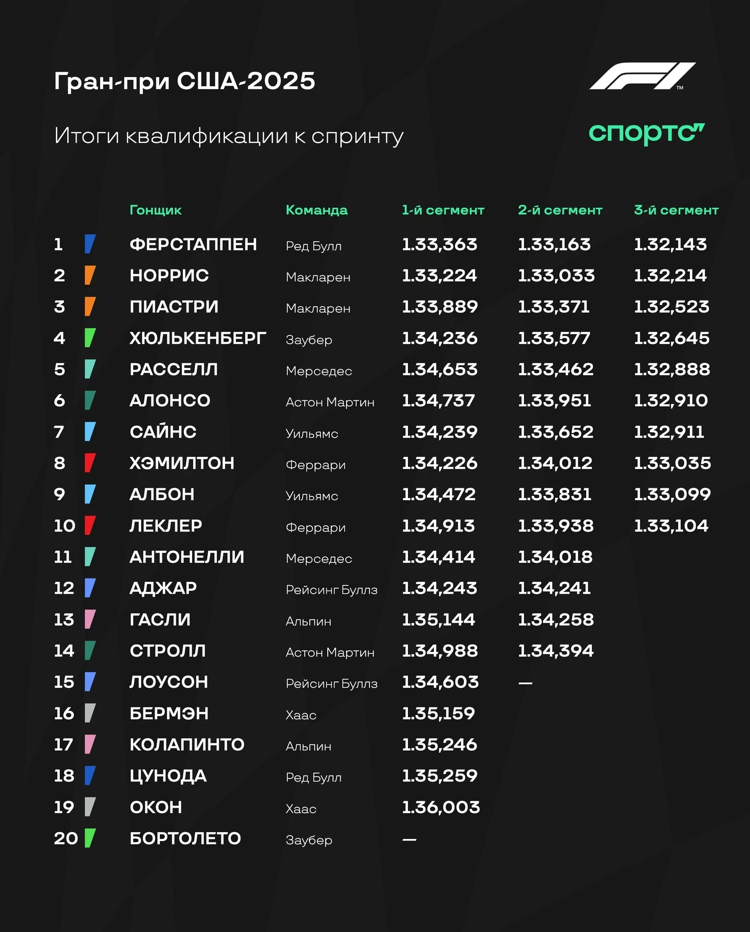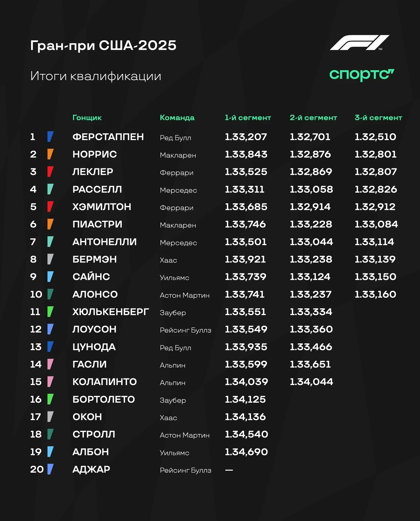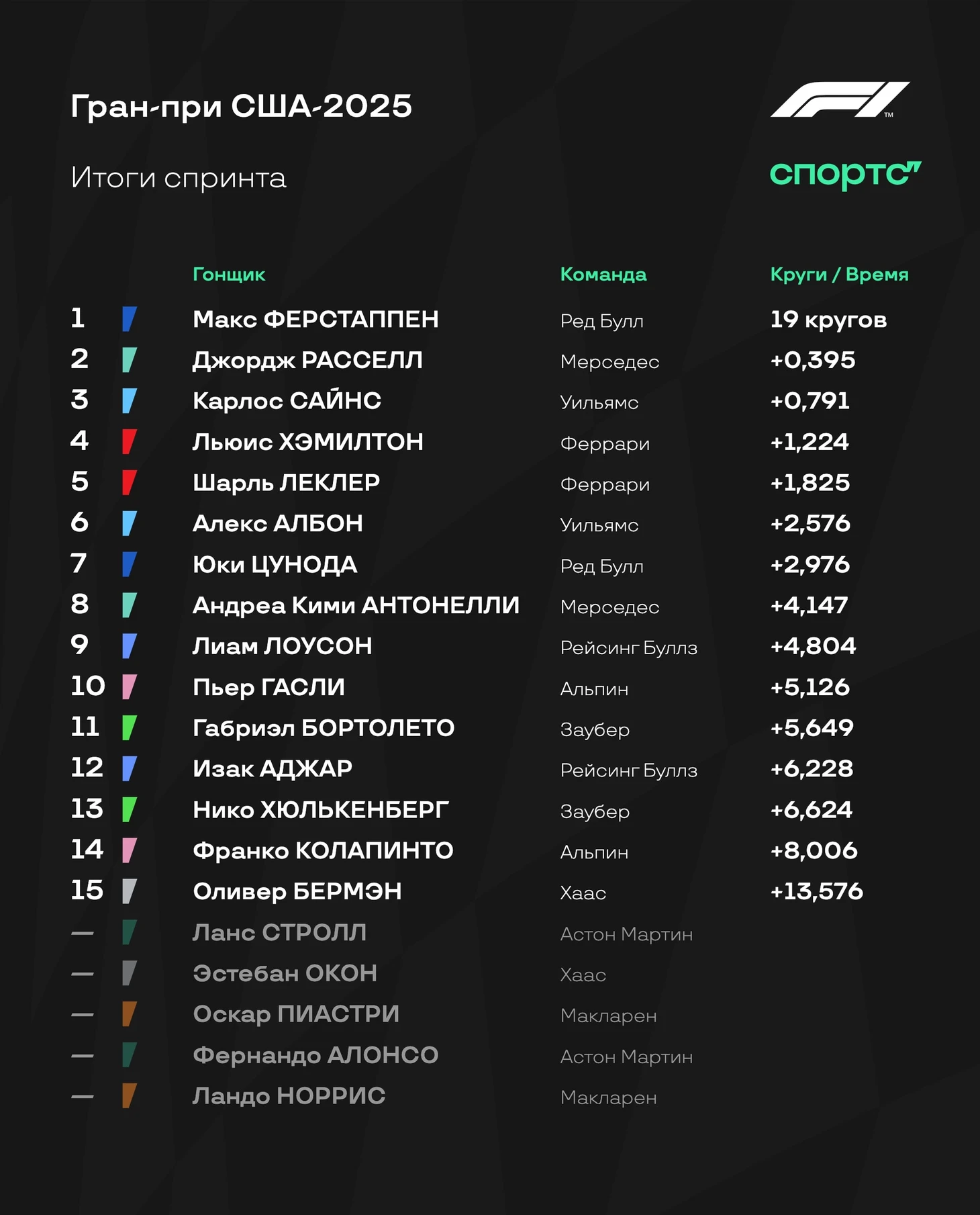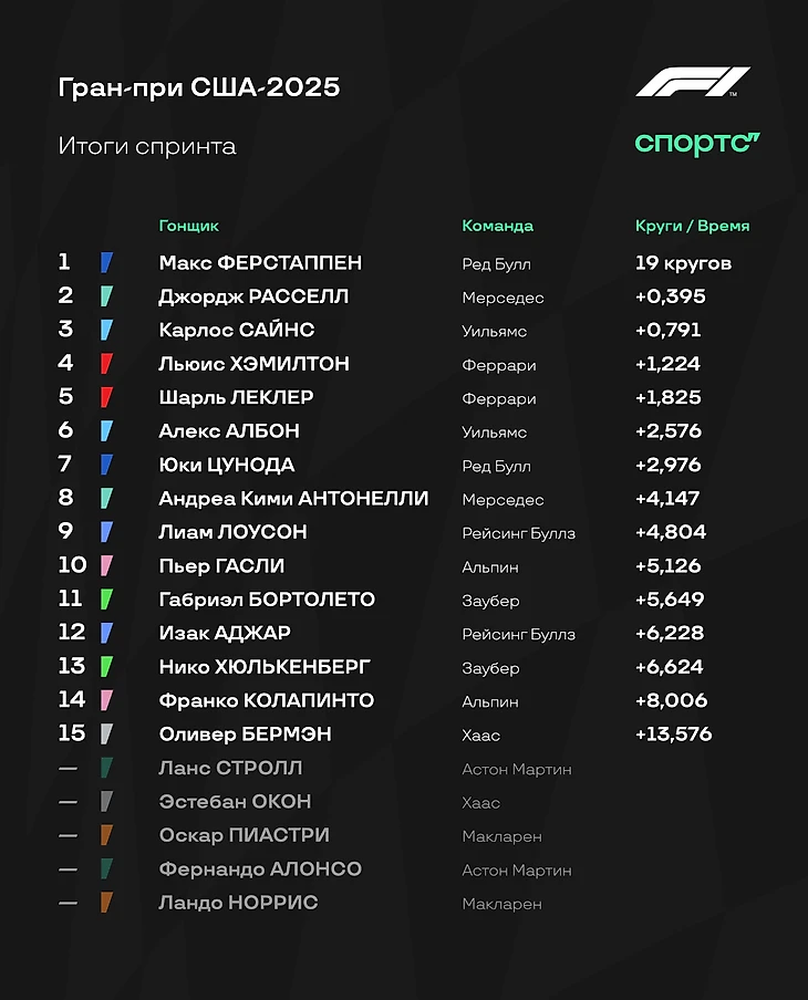 Благодаря схватке «Феррари» и «Макларена» Ферстаппен спокойно доехал до финиша первым – и оформил все победы на Гран-при: спринтопоул, спринт, поул и гонка! Норрис и Леклер закрыли подиум, а за ними драма – Хэмилтон с проколом едва успел проскочить перед Пиастри.