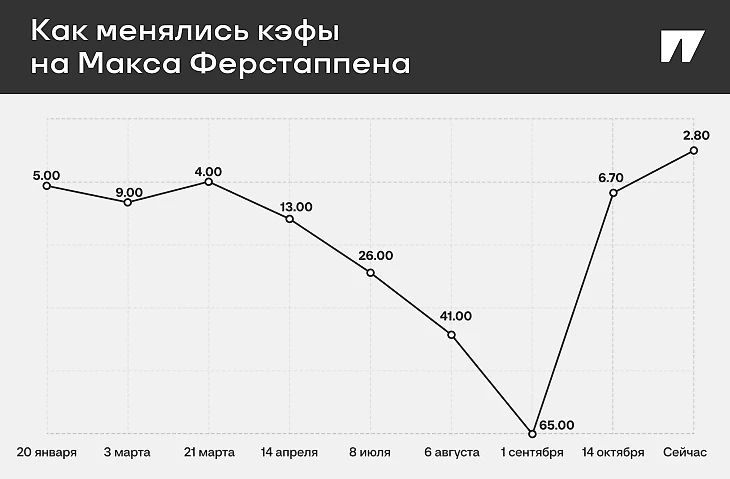И снова отмечаем феноменальный взлет голландца после серьезного падения. В конце лета и начале осени победа Ферстаппена в чемпионате котировалась на уровне 1-2%. После Сингапура скакнула до 15%. Сейчас он фактически уже наравне с конкурентами. Что за турбулентный сезон!