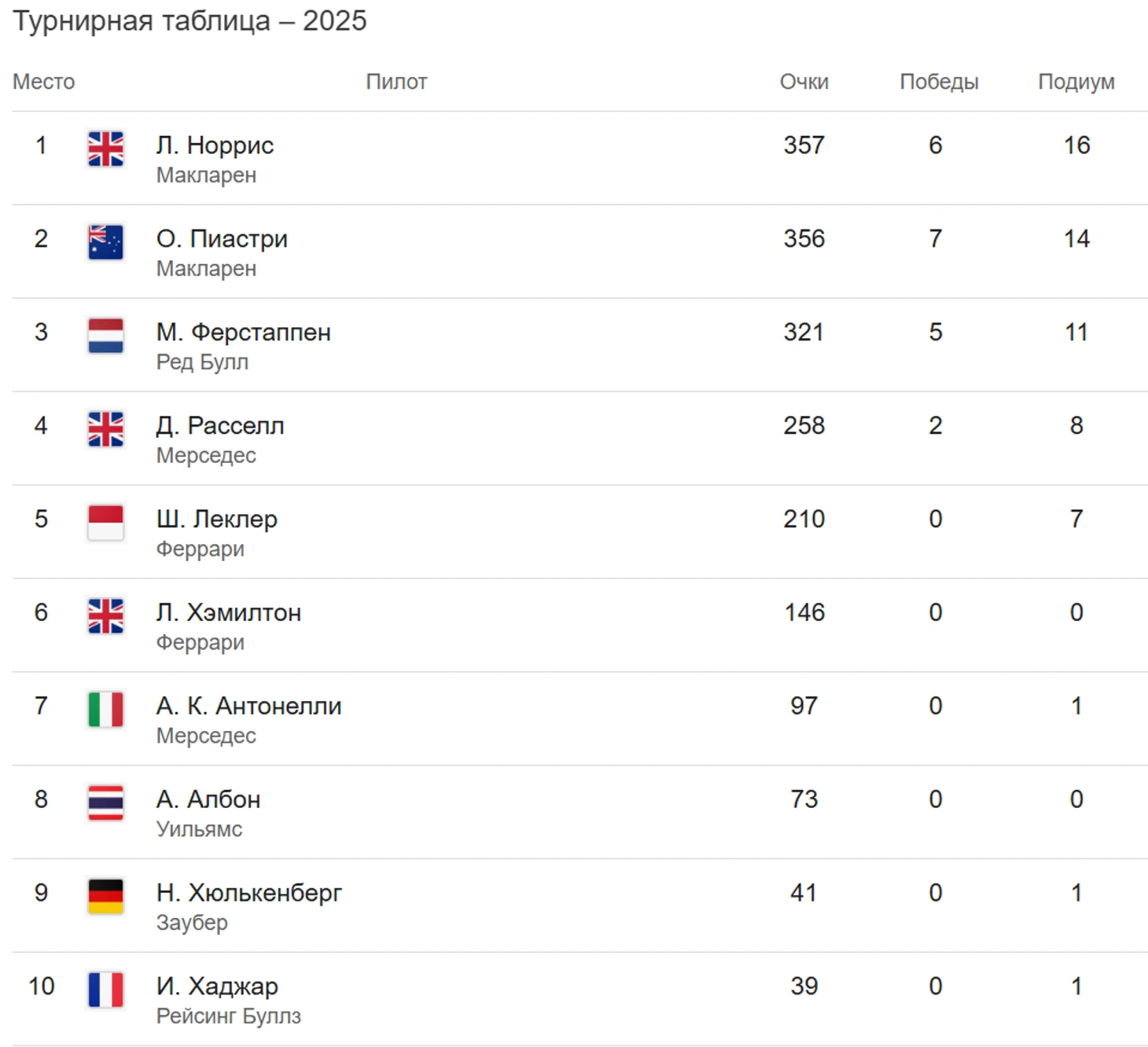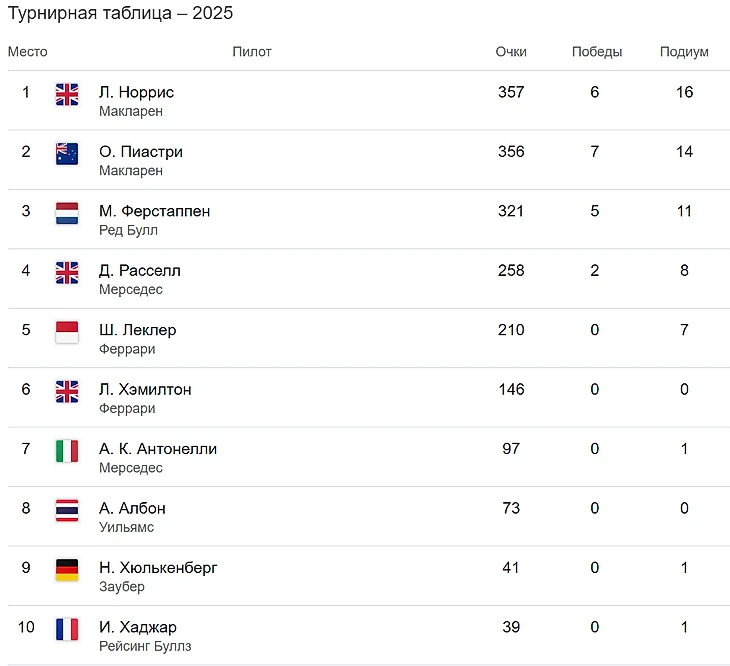 Поскольку Пиастри финишировал пятым (подробнее об этом ниже), результат Норриса означает, что он впервые возглавил турнирную таблицу чемпионата с момента Гран-при Саудовской Аравии в апреле. Правда, его преимущество над напарником по команде составляет всего одно очко.