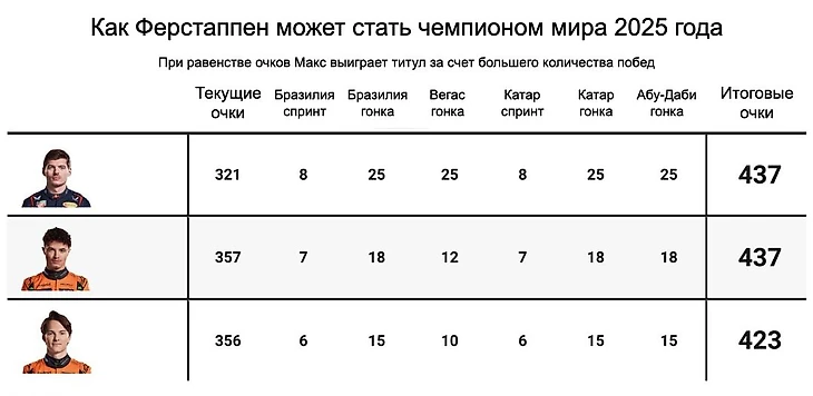 Более того, титул Макса без провалов «Макларена» теперь кажется пусть тяжелейшей, но уже не фантастической задачей. При собственных идеальных выступлениях нидерландца устроят вторые места Норриса во всех гонках и спринтах, кроме проблемного для британцев Вегаса.