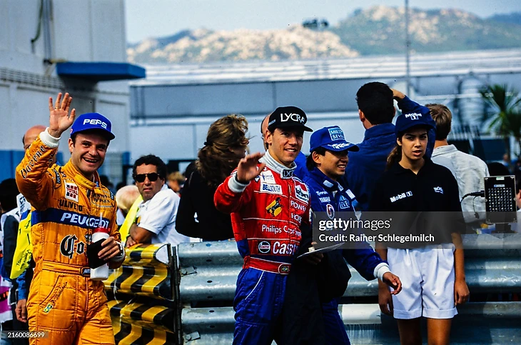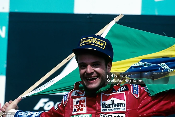Мой первый Гран-при был в Кьялами, за «Джордан», и я помню это невероятное чувство, когда находишься на одном брифинге гонщиков с такими людьми, как Айртон, Ален [Прост], Михаэль [Шумахер], Герхард [Бергер] и так далее. Это было так…» – он ищет подходящее слово, затем останавливается на: «...прекрасно. Это было так наполнено энергией. Но в той гонке, в Кьялами, у меня сломалась коробка передач, и еще одна поломка коробки передач случилась в следующей гонке, дома, в Интерлагосе. Затем была гонка в Донингтоне, когда было очень мокро, и я показал себя хорошо, потому что я всегда был быстр под дождем, но потом у меня закончилось топливо. И в тот уик-энд я встретил Джорджа Харрисона, битла, и он сказал мне: «У тебя музыкальное имя, потому что «бари» – это музыкальный термин, сокращение от «баритон», и «челло» – тоже. Вот почему я хотел подойти и поздороваться с тобой». Это был потрясающий опыт для парня из Интерлагоса».