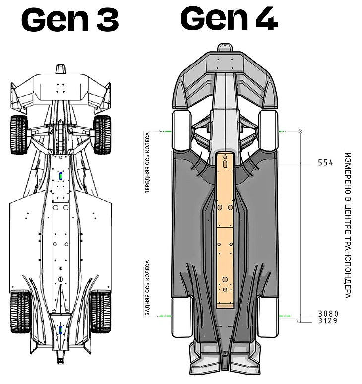 Болид нового поколения на 520 мм длиннее Gen3 Evo, имеет колесную базу 3080 мм по сравнению с нынешними 2705 мм и ширину 1800 мм вместо 1707 мм.