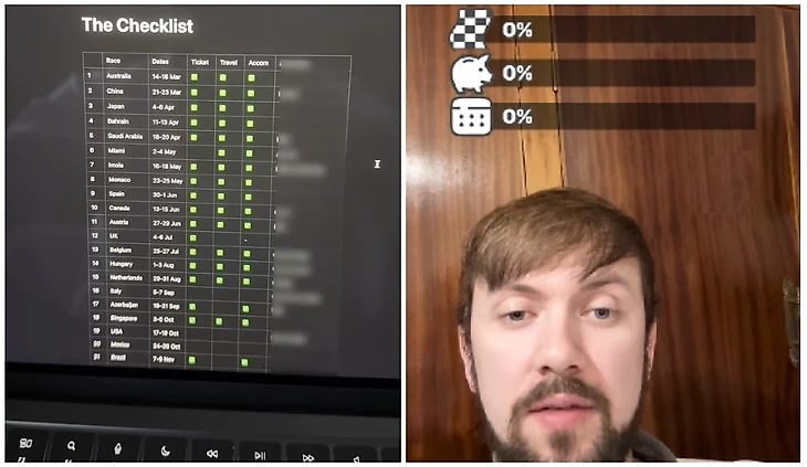 В одном из первых видео (февраль) он показал, что на тот момент у него была бронь отелей почти на все гонки. К примеру, Брэндон тогда еще не приобрел билеты на Гран-при Майами, Италии, США и Мексики. На три последних гонки у него также не было места для жилья.