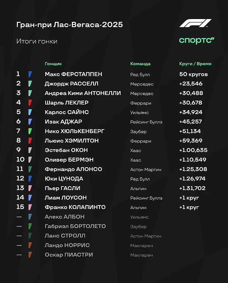 В итоге Пиастри не смог опередить Антонелли на трассе, но обошел его на финише из-за штрафа (в итоге пилота «Макларена» дисквалифицировали за высокий износ планки днища), а Леклер настолько уничтожил шины, что отстал на более чем пять секунд – не хватило всего 0,19 с.