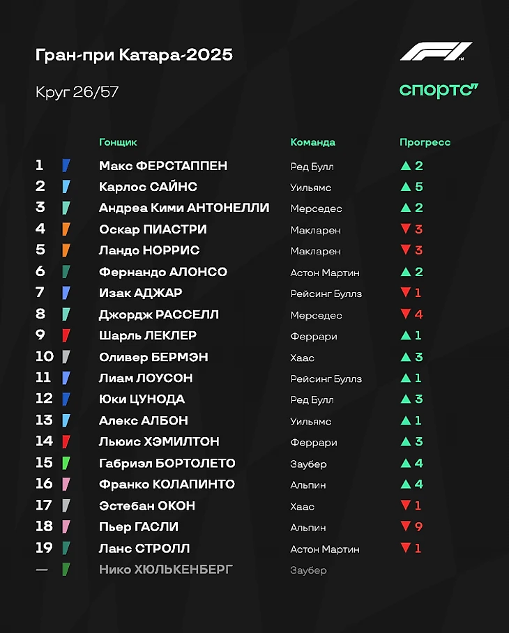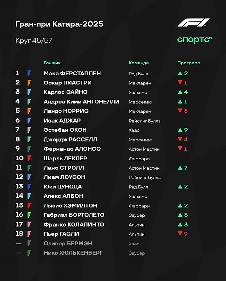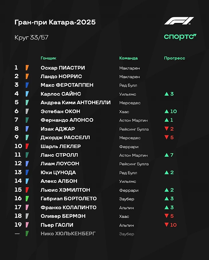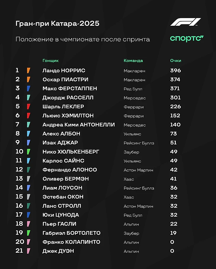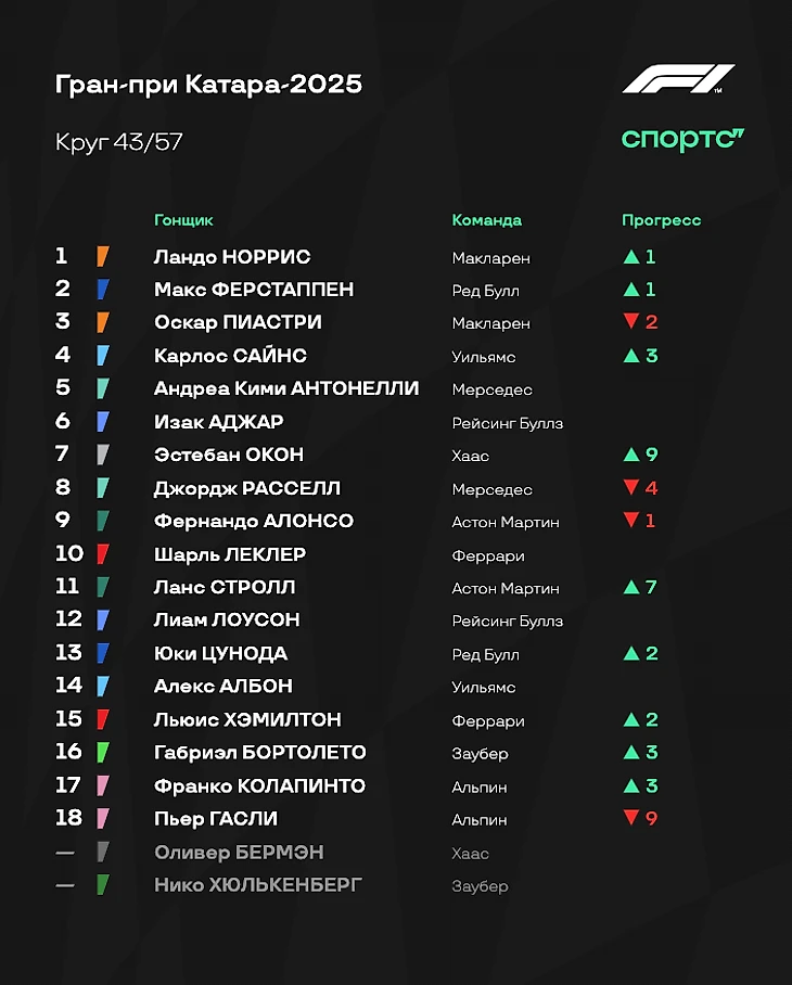 - Спасибо, что были с нами - и увидимся через неделю. Судьба чемпионского титула решится на Граен-при Абу-Даби, шансы сохраняют Норрис, Пиастри и Ферстаппен. До встречи!