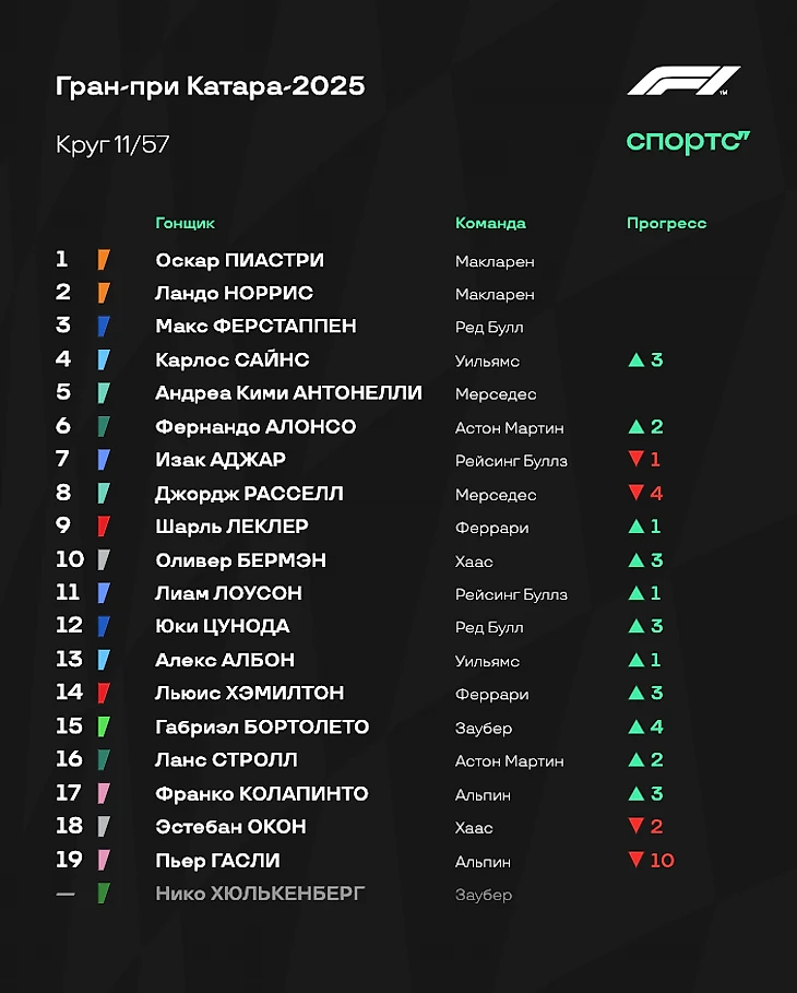 Интересно, насколько быстро будут прорываться Пиастри и Норрис. Первое препятствие - Антонелли. Разница в свежести шин - 17 кругов. В пользу Пиастри - трудность обгонов на трассе в Катаре в принципе. Единственное место - торможение в первом повороте.