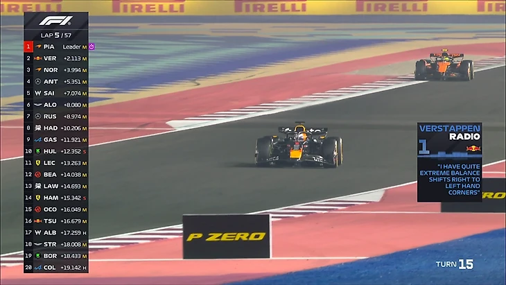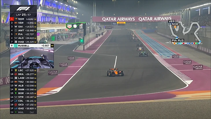 Пиастри и Норрису сейчас приходится очень активно атаковать - они едут в среднем на 0,5 секунды быстрее остальных, стараясь отыграть время. Ибо если они проведут пит-стопы прямо сейчас, от окажутся вообще последними. Притом, что обгонять на трассе «Лусаил» чрезвычайно трудно и преимущество в свежести шин тут не столь эффективно.