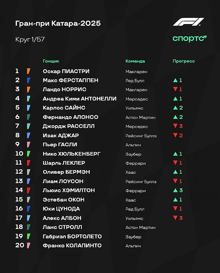 Пиастри сохраняет лидерство, а вот Норрис теряет одну позицию - старт с «грязной» стороны трассы сказался, Макс Ферстаппен опережает Ландо!