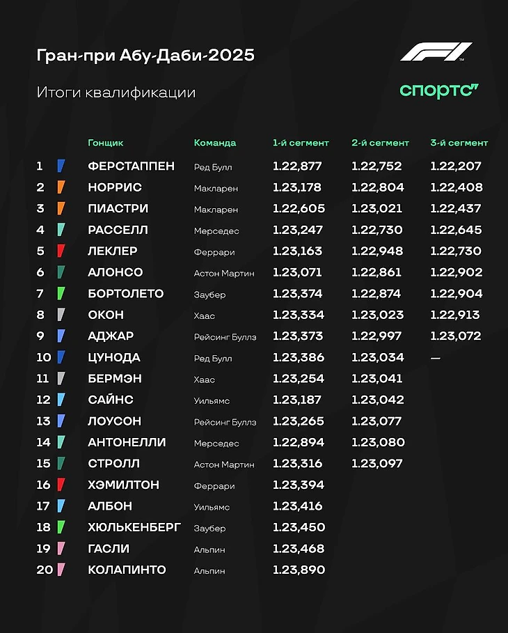 Ферстаппен – на поуле в решающей гонке сезона! Норрис и Пиастри – сразу позади