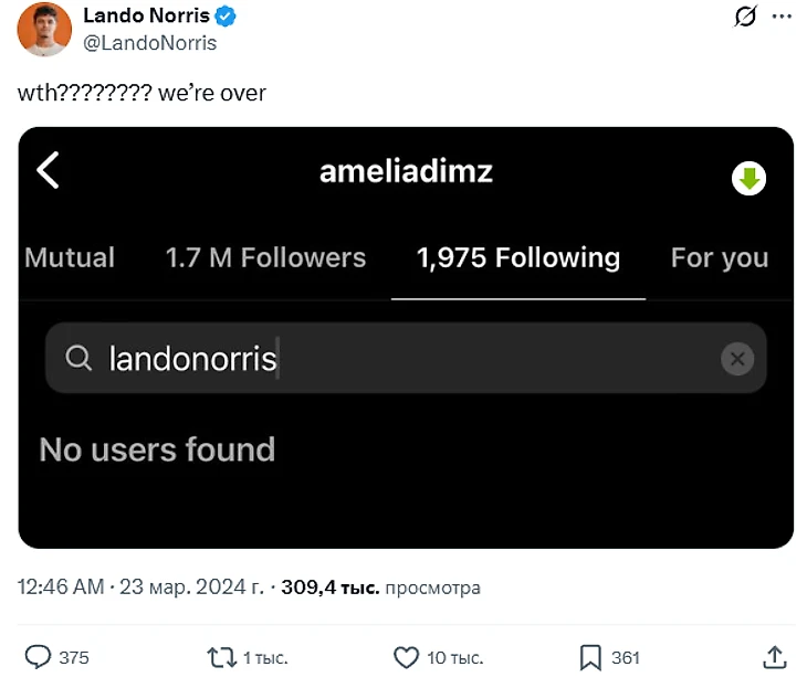 Британская ютуб-блогер Амелия Димольденберг записала с Норрисом интервью и выложила превью со следующим комментарием: «Секрет раскрыт». Ландо прогрел публику забавным подыгрышем: «Что за хрень? Мы расстаемся». Не обнаружил себя в инстаграм-подписках Амелии.