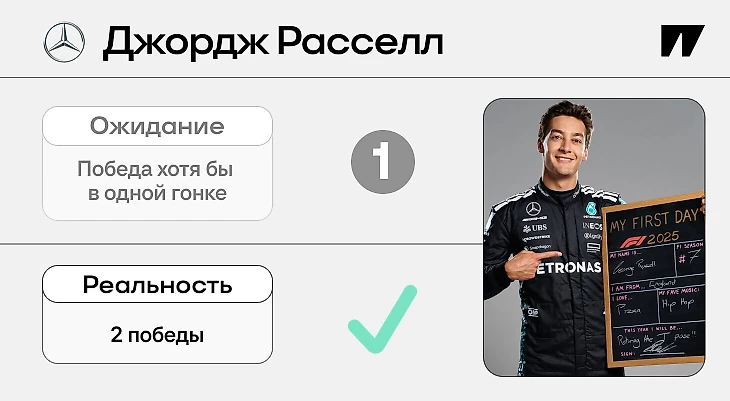 Главным бенефициаром падения черного жеребца стал «Мерседес»: Джордж Расселл и Кими Антонелли выступили лучше ожиданий. Британец занял четвертую строчку вместо прогнозируемой шестой, а итальянец замкнул топ-7, хотя котировался восьмым.