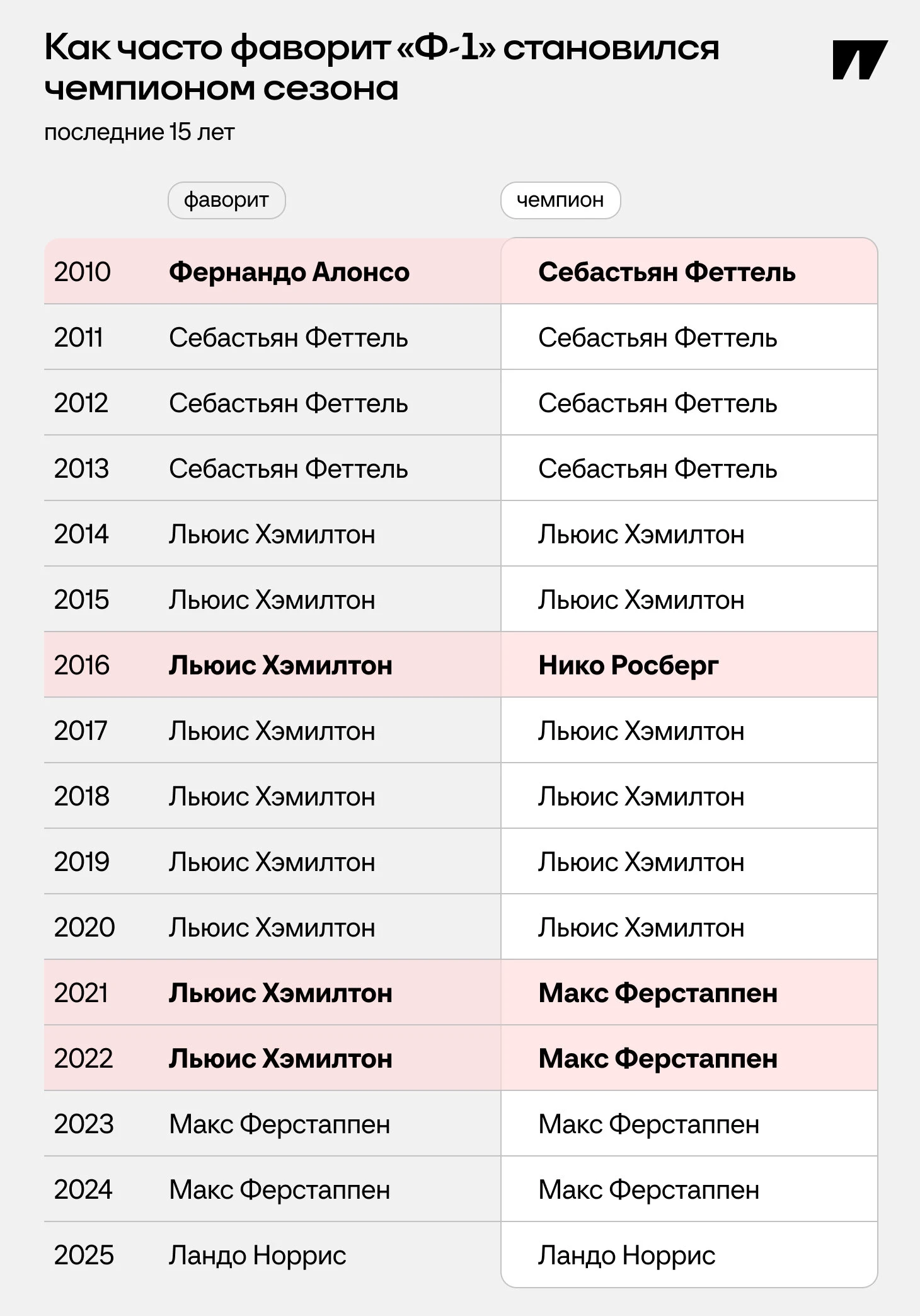 Льюис терял титул в статусе фаворита не только из-за Ферстаппена – в 2016-м его обошел Нико Росберг. А в 2010-м фаворитом считался Фернандо Алонсо, но победил Себастьян Феттель. Разница в шансах была небольшой: 33% у испанца против 25% у немца.
