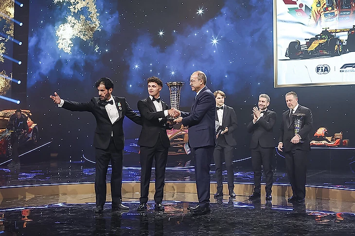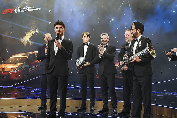 Вероятно все это так растрогало Норриса, что свою речь он произносил с нарушением всех формальностей – поворачиваясь к залу спиной, засунув руку в карман и случайно матюгнувшись, когда говорил о «проблемах и [провалах]» команды по ходу сезона. В ответ на это бен Сулайем пошутил, что хотел бы оштрафовать Ландо на 5000 евро за мат, но решил, что деньги еще понадобятся парню на новую прическу. Дело в том, что когда Норрис вышел на сцену президент ФИА первым делом по-отечески хорошенько взъерошил ему волосы.