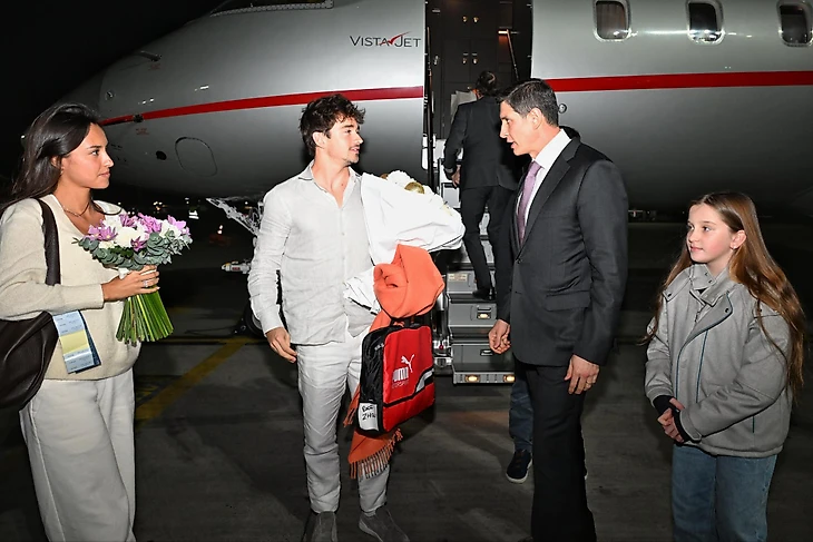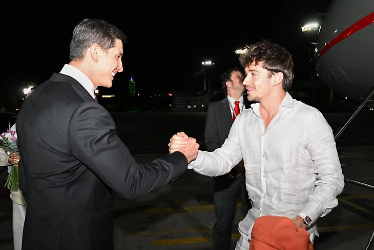 Что Шарль, не попавший в тройку призеров, забыл на церемонии награждения ФИА? Во-первых пилот «Феррари» должен был вручить призы в двух номинациях, а во-вторых в Ташкент его пригласили на самом высшем уровне, а именно зять президента Узбекистана и первый зампред Национального Олимпийского Комитета Отабек Умаров. Вот, он лично встречает Леклера в аэропорту.