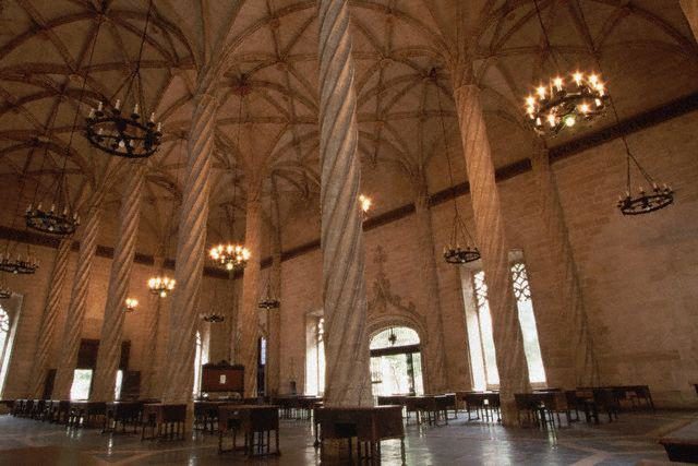 Мрачный интерьер готической биржи Ла-Лонха внесен в Список Всемирного наследия ЮНЕСКО благодаря уникальному главному залу с изящным потолком, поддерживаемым стройными спиральными колонами.