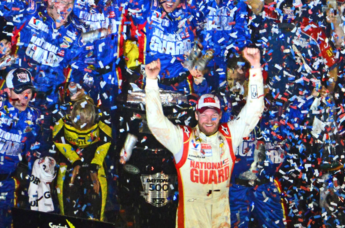 Под пейскаром Эрнхардт поймал на решетку радиатора клейкую ленту от машины Райана Ньюмана, что могло привести к перегреву мотора, потери мощности и даже сходу лидера. Но все, к счастью для Дейла, обошлось! Атака Кезеловски по внешнему радиусу была заблокирована, а после столкновения Кайла Буша, Джейми МакМюррея и Кевина Харвика в последнем повороте последнего круга был выброшен желтый флаг, который автоматически остановил гонку и объявил о второй победе в «Дайтоне-500» для Дейла Эрнхардта-младшего. Топ-5 кроме него составили Дэнни Хэмлин, Бред Кезеловски, Джефф Гордон и Джимми Джонсон.
