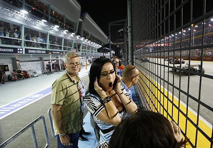 Кэти Перри на Гран-при Сингапура 2012 года подпевает реву двигателей.