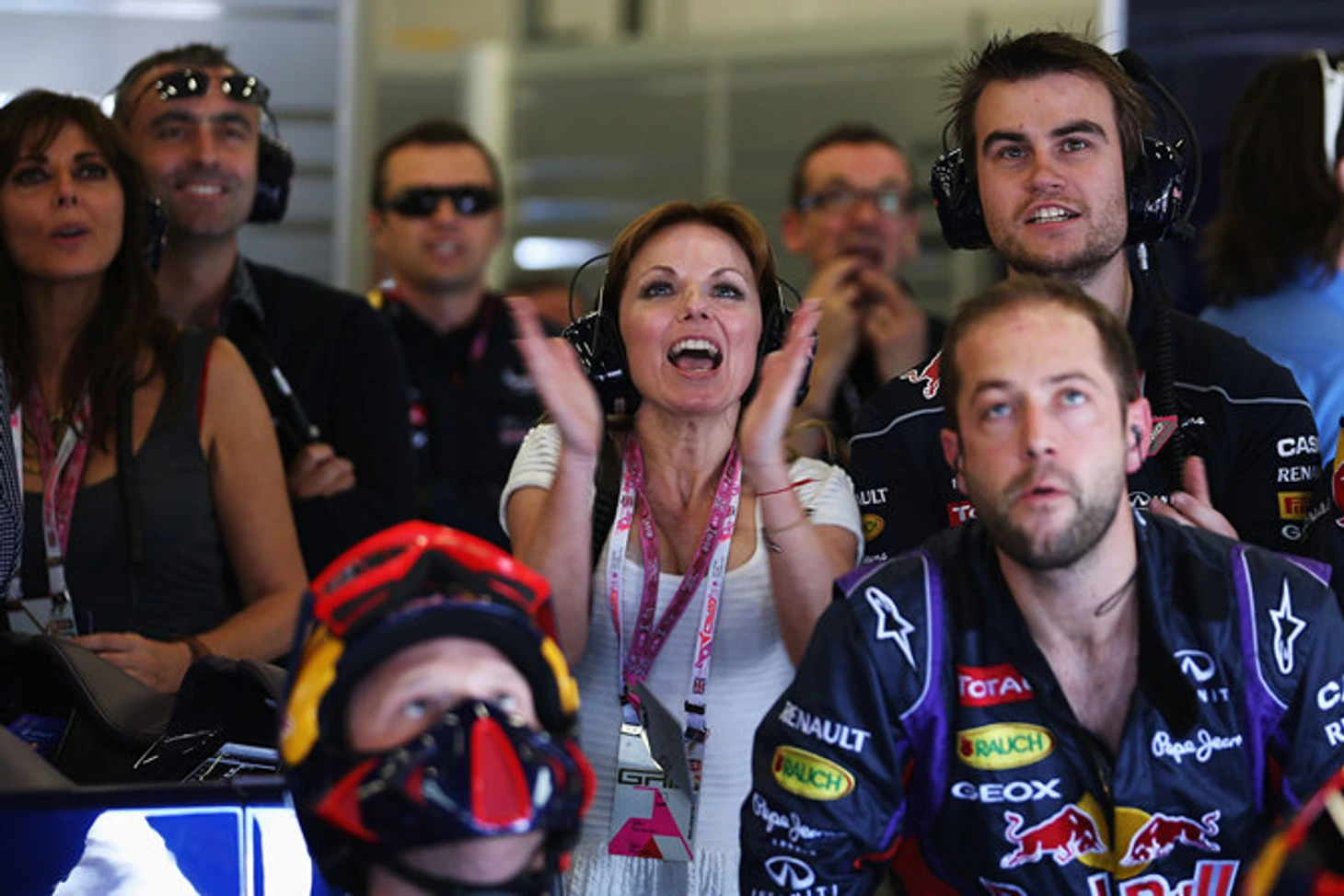 Джери Холлиуэлл в окружении механиков «Ред Булл» на Гран-при Великобритании в 2013 году.