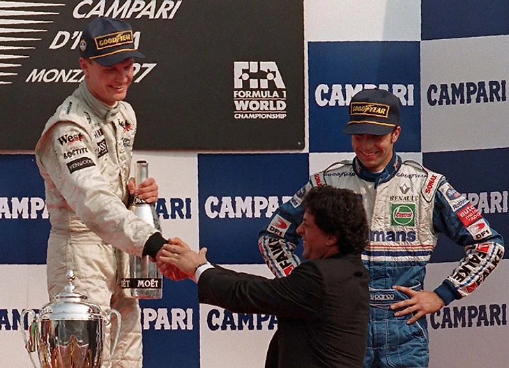 Сильвестр Сталлоне лично поздравляет победителя Гран-при Италии 1997 года Дэвида Култхарда. «Слай» долго ездил на этапы «Формулы-1», собирая впечатления для фильма о гонках, но когда рассказал сюжет Берни Экклстоуну, отношения между актером и промоутером сильно испортились. В итоге Сталлоне снял провальный фильм о серии CART.