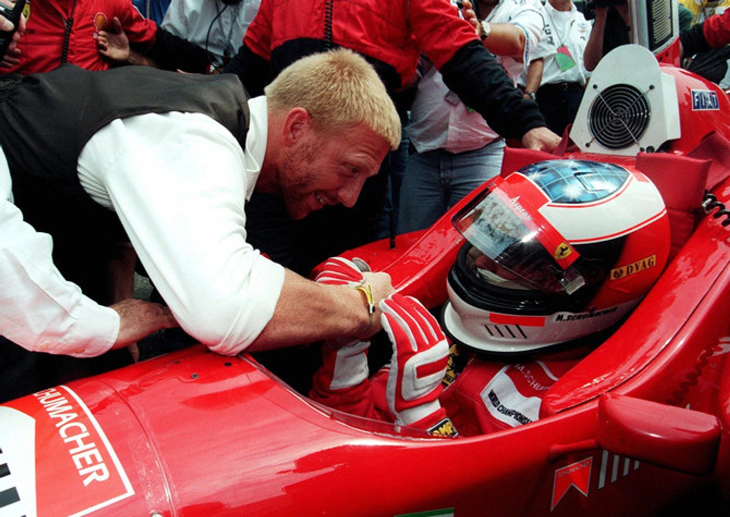 Борис Беккер желает удачи Михаэлю Шумахеру перед стартом Гран-при Германии 1996 года.