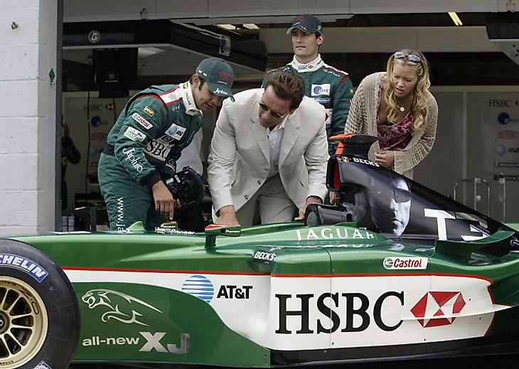 Гран-при Великобритании 2003 года. «Ягуар» проводит акцию в поддержку фильма «Терминатор 3». Антонио Пиццония объясняет Арнольду Шварценеггеру и Кристанне Локен назначение красной кнопки в кокпите болида, а Марк Уэббер, похоже, вживается в роль киборга.