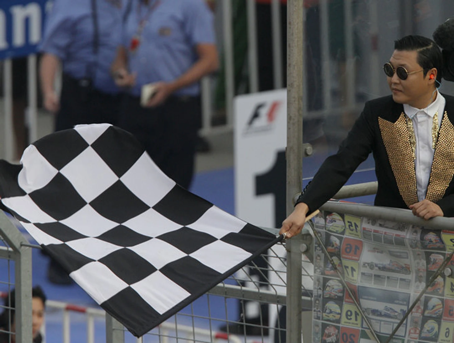 В 2012 году весь мир узнал о «Ганэм-стайле» Псая, и организаторы Гран-при Кореи поняли, что не пригласить этого парня на гонку будет настоящим преступлением. Отмашку клетчатым флагом давал именно корейский музыкант.