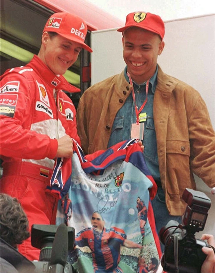 Гран-при Испании 1997 года. Шумахер получает в подарок футболку от Роналдо, а бразильский футболист – кепку «Феррари».