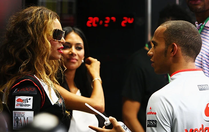 Николь Шерзингер, Бейонсе и Льюис Хэмилтон обсуждают предстоящий концерт F1 Rocks на Гран-при Сингапура 2009 года.