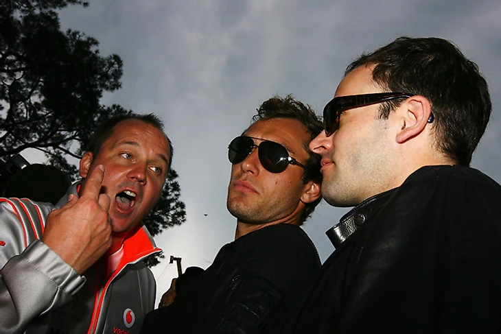 Джуд Лоу (в центре) и Джонни Ли Миллер (справа) слушают байку от инженера «Макларена» перед Гран-при Монако 2007 года.