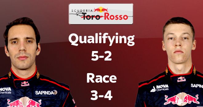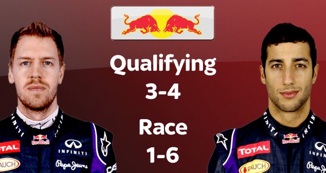 Признайтесь, никто не ожидал такого расклада в паре "быков"? Но уже сейчас можно с уверенностью говорить о том, что сезон превращается для Дэна в сказочный. Кто бы мог подумать, что австралиец ни разу не уступит Себастьяну в гоночном режиме? Исключением стал Гран-При Малайзии, но мы помним, что причиной тому стало плохо закрепленное колесо. Более того, Себастьян испытывает проблемы и в квалификационном режиме: немец проиграл Даниэлю четыре из пяти первых сессий, и, как и его соотечественник, сумел приблизиться только в последних двух Гран-При
